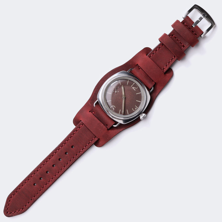 Originally crafted for German aviators during WW2, the bund strap features an extra piece of leather within that protects the wearer's wrist from extreme temperatures. When the extra piece-bund is removed, the strap transforms into a classic watch strap.