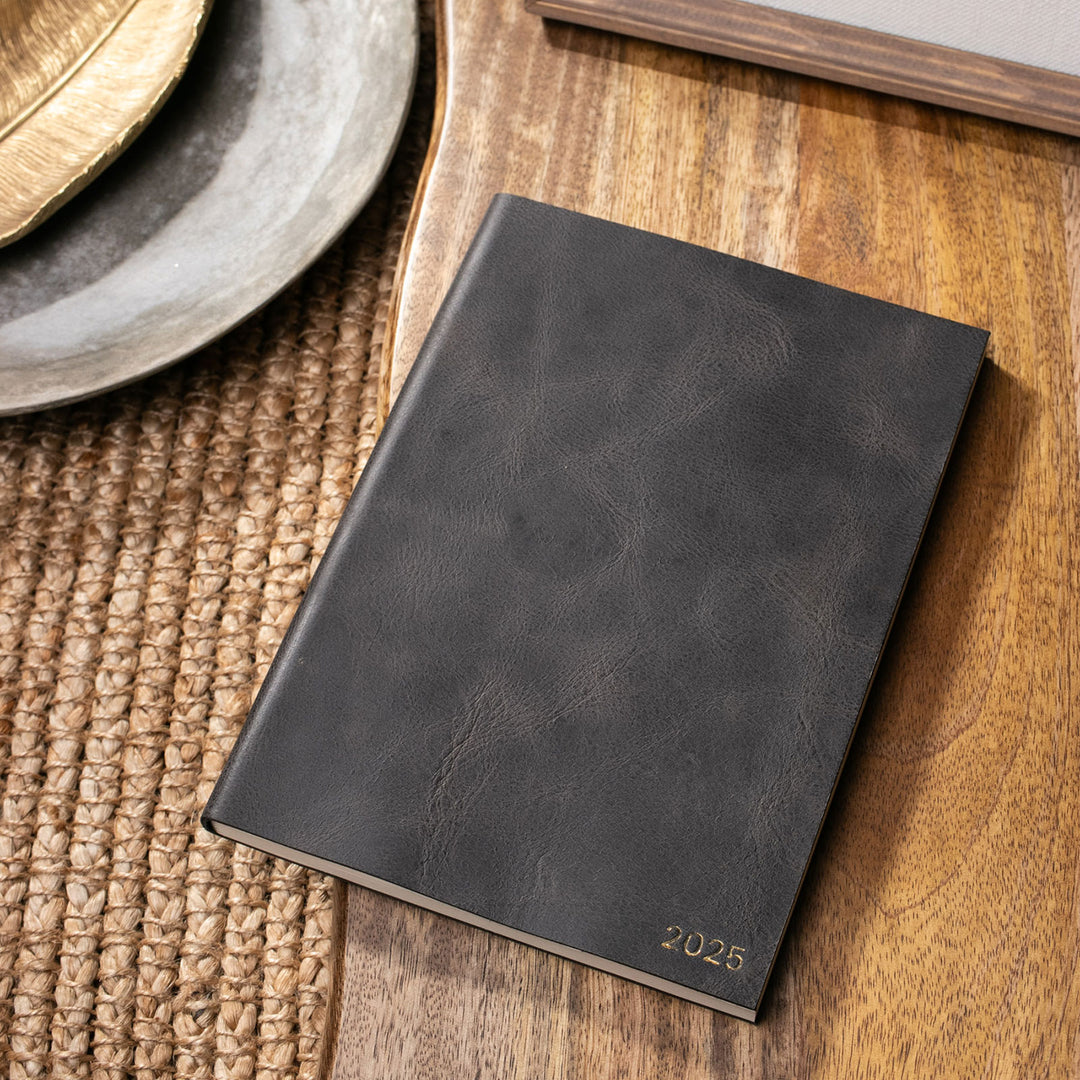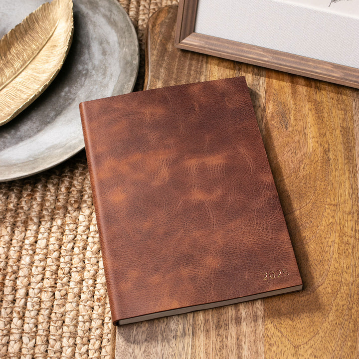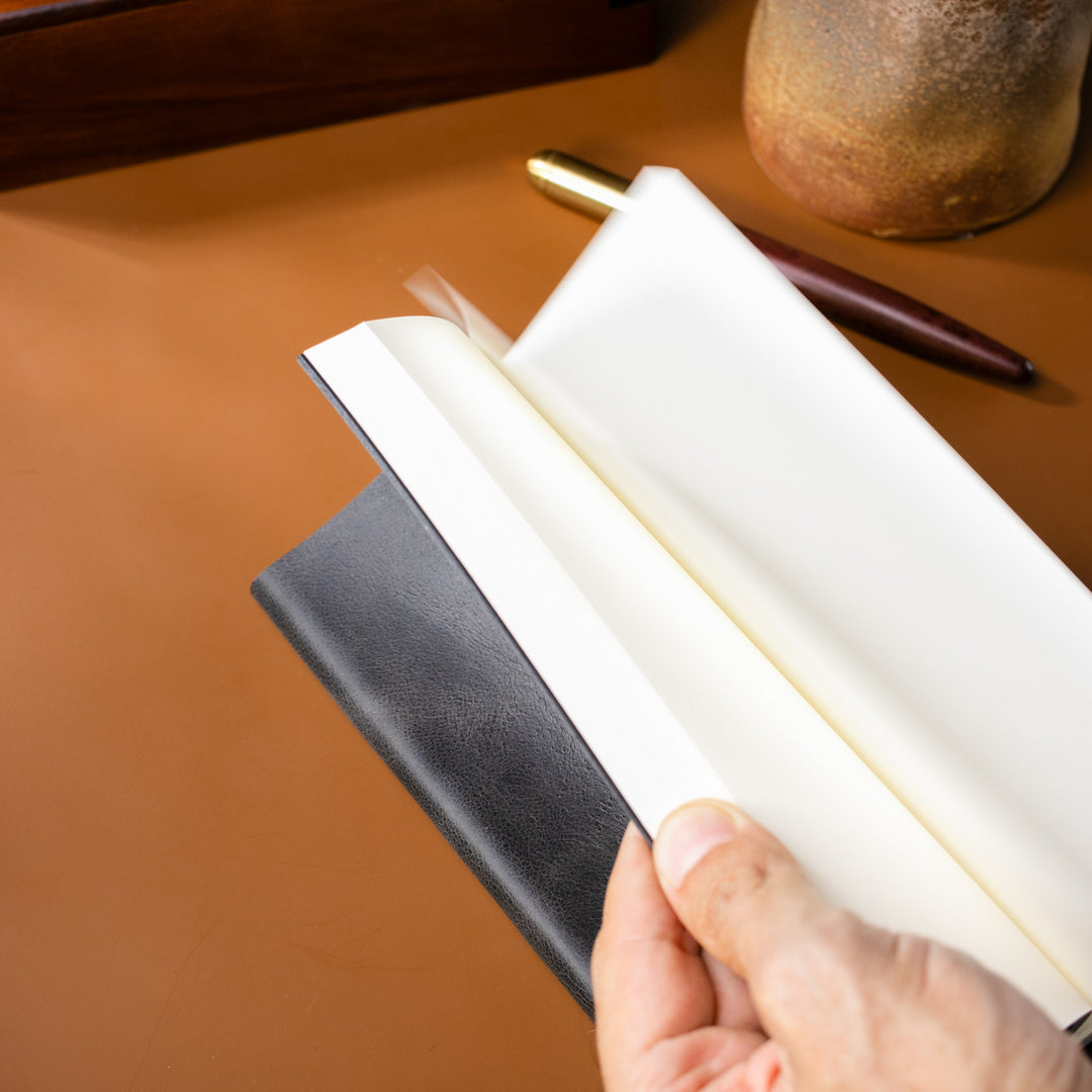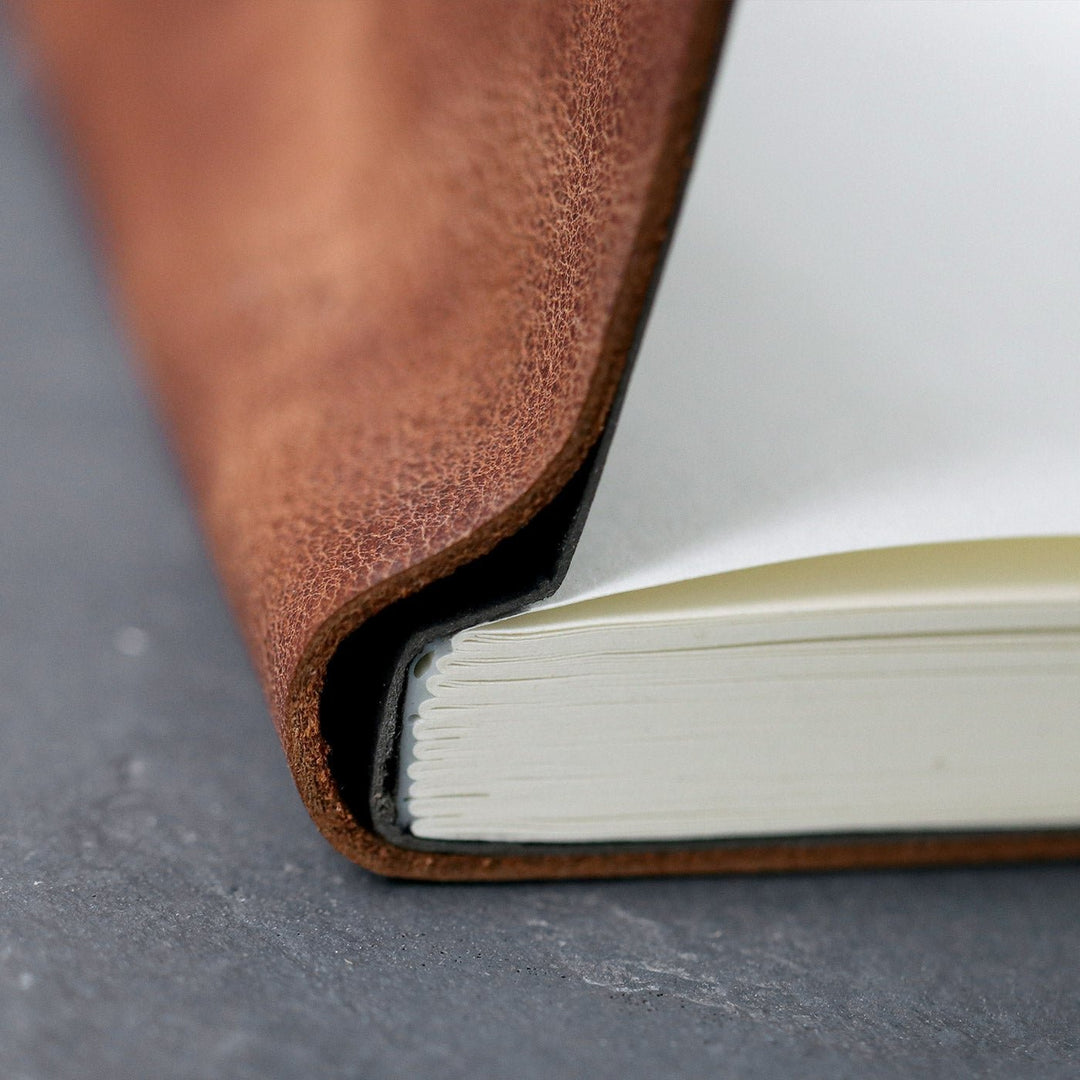 These personalized leather journals are hand bound with full-grain leather and have a flat minimal design.